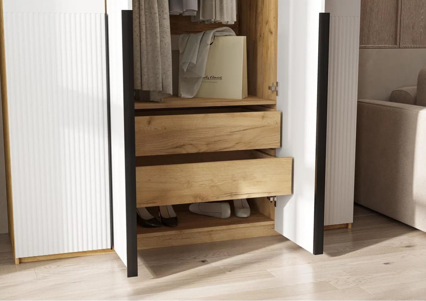 - Удобные ящики: Шкаф оснащен несколькими вместительными ящиками, которые позволяют удобно хранить вещи, документы или аксессуары. Каждый ящик легко открывается и закрывается, что обеспечивает комфортное использование.